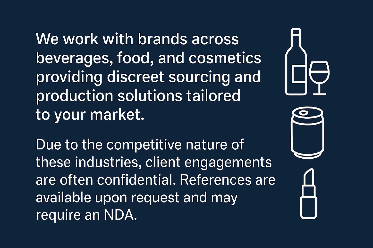 Solara Sourcing delivers reliable sourcing solutions for brands across beverage, food, and cosmetic industries. Our team combines deep industry knowledge with hands-on experience across national and international markets, giving us a unique perspective on trends, supplier networks, and production needs.